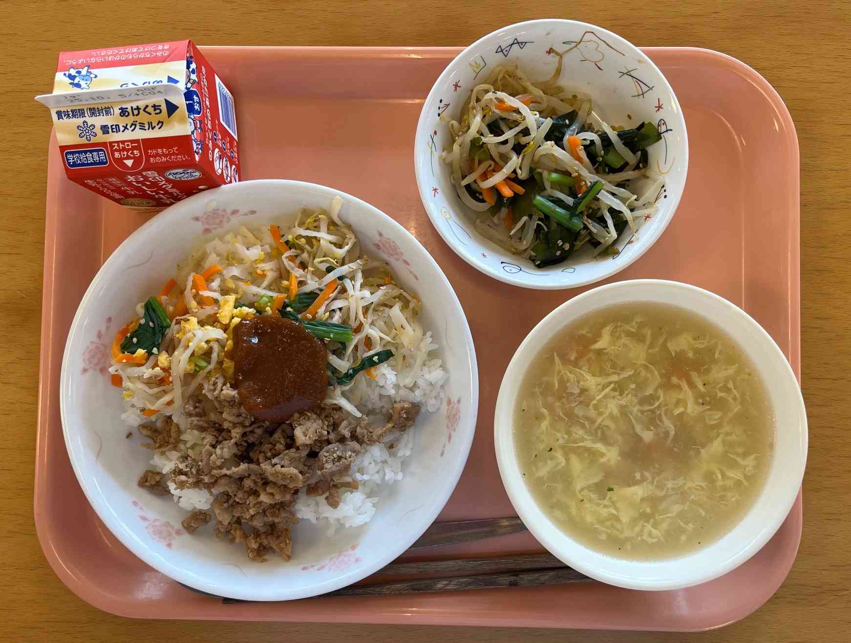 ・牛乳 ・ビビンバ ・もやしとわかめのごま醤油 ・中華風コーンスープ