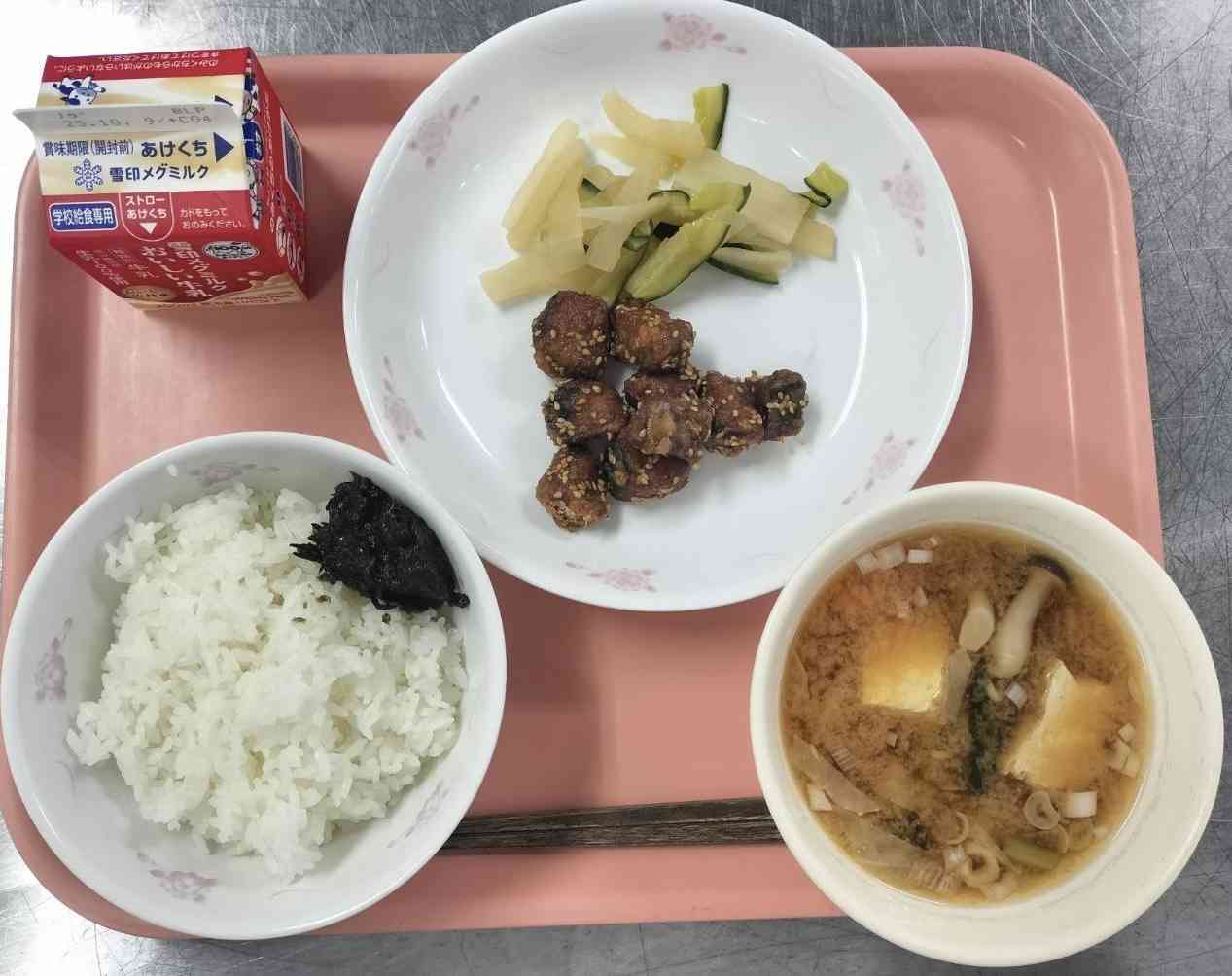 ・牛乳 ・ご飯(のりの佃煮) ・かつおのごま味噌和え ・大根の浅漬け ・野菜と生揚げの味噌汁