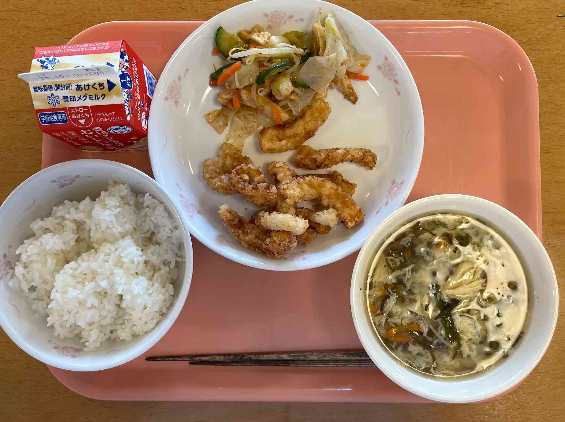 ・牛乳 ・ご飯 ・いかのかりん揚げ ・味噌ドレッシングサラダ ・めかたま汁