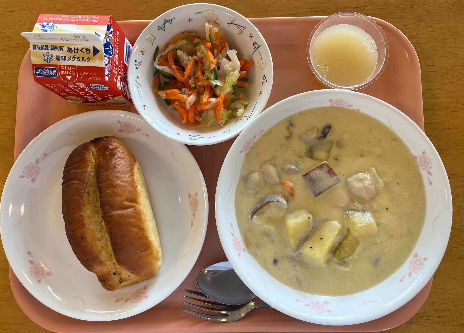 ・牛乳 ・ガーリックフランス ・秋のシチュウ ・にんじんサラダ ・りんごゼリー