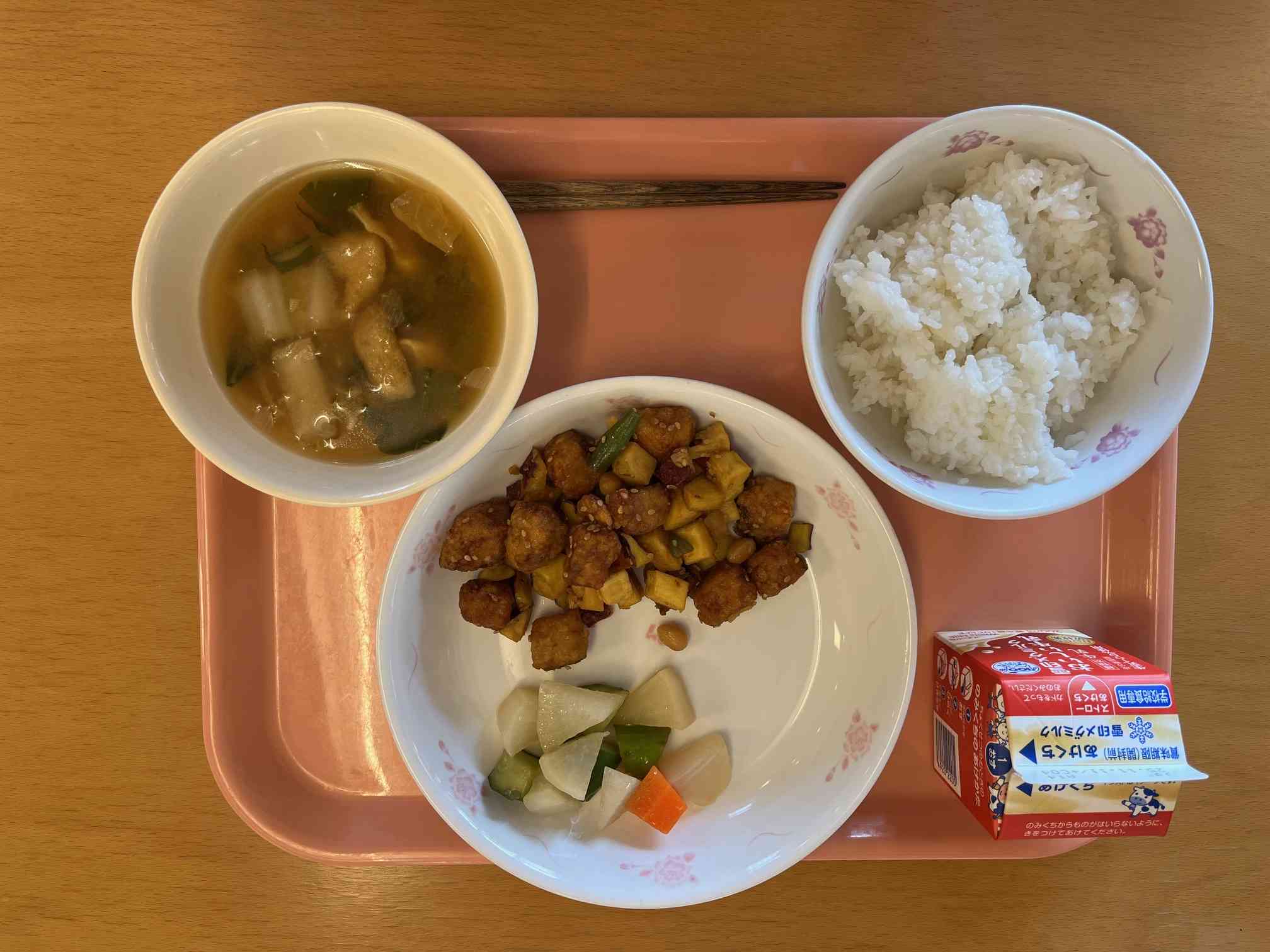 ・牛乳 ・ご飯 ・魚と野菜の五色煮 ・華風甘酢 ・味噌汁