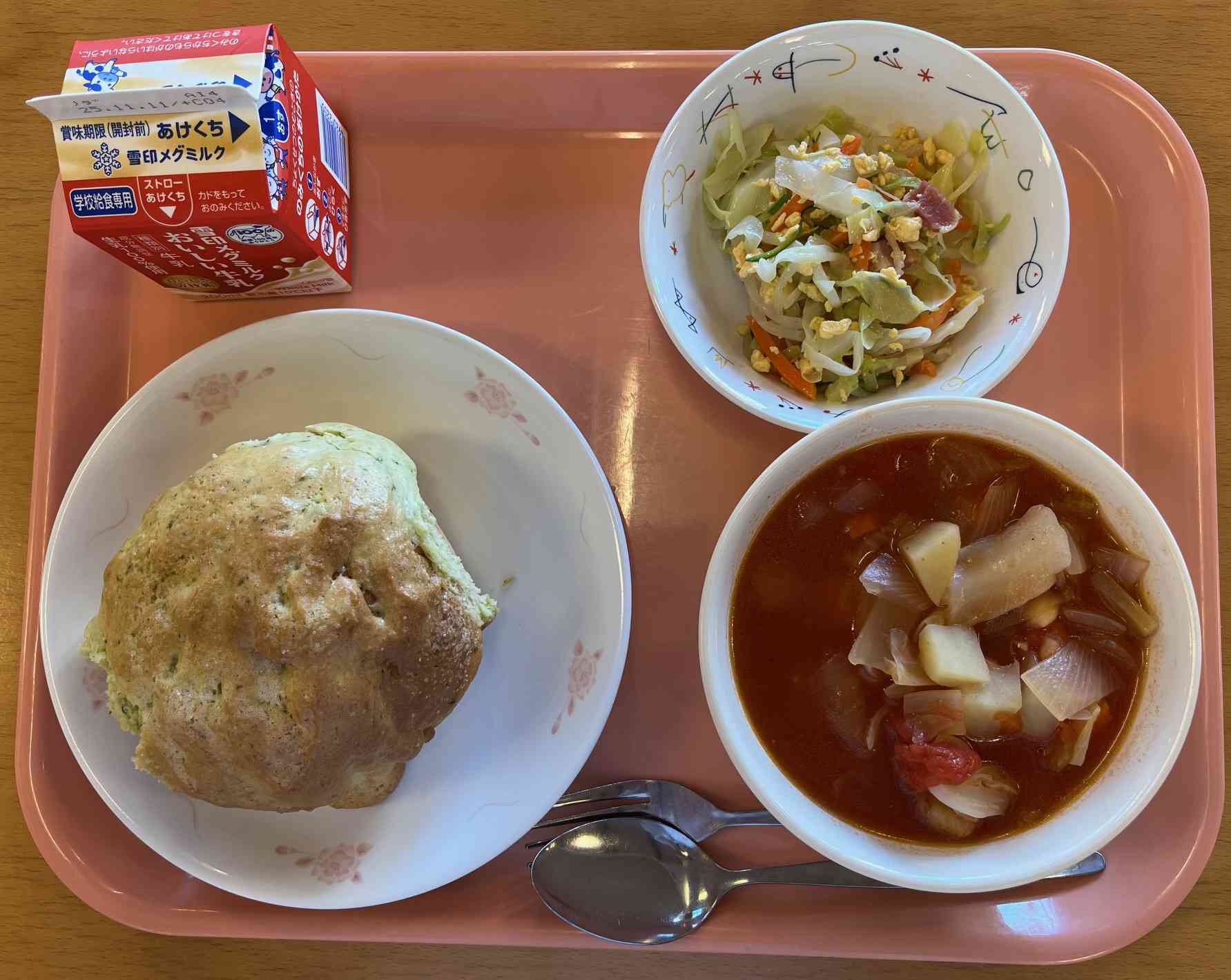 ~野菜残しゼロ運動~ ・牛乳 ・メロンパン ・ミネストローネ(3年生給食委員メニュー) ・ベーコンと卵のサラダ