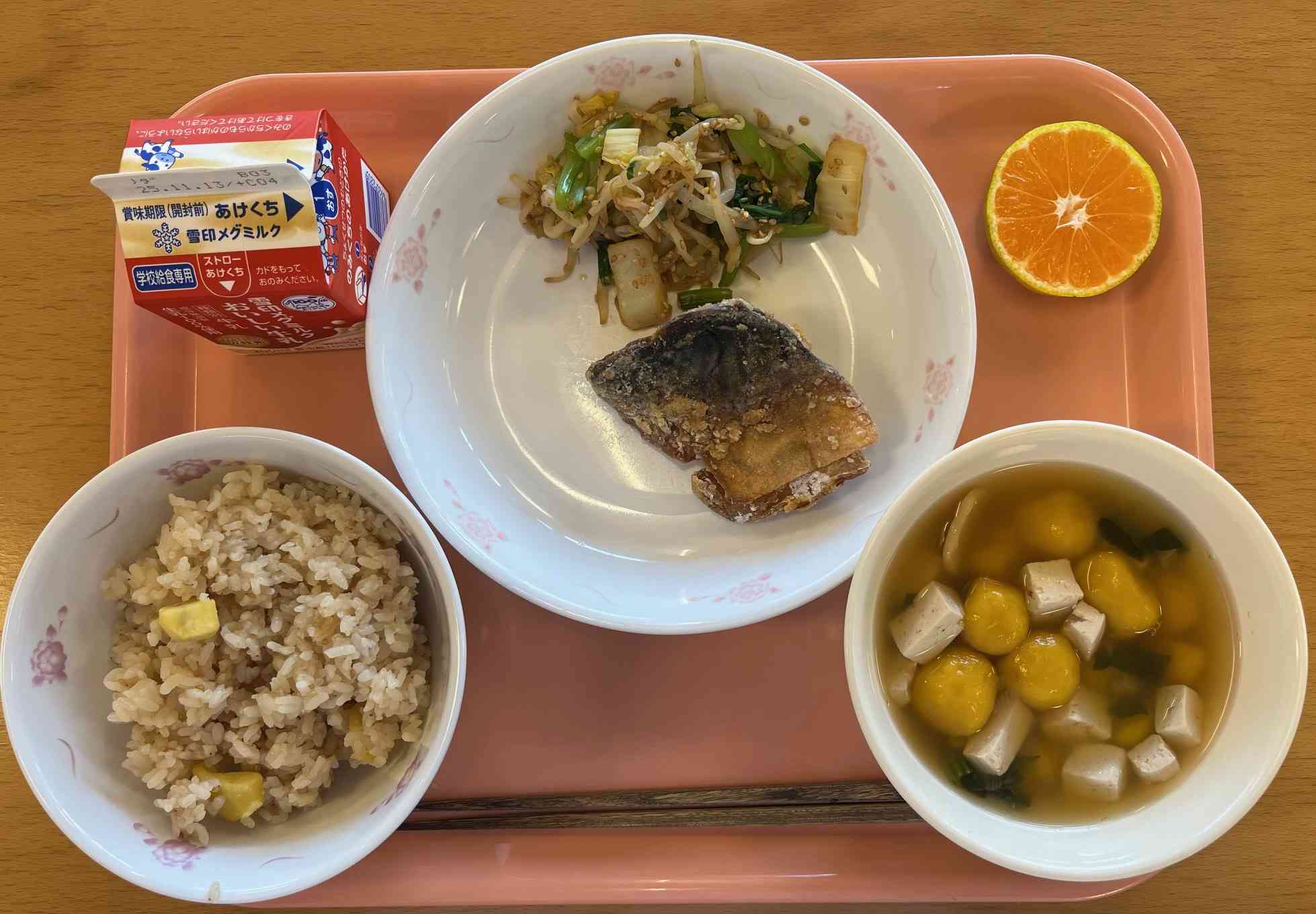~十三夜給食~ ・牛乳 ・栗ご飯 ・さばの竜田揚げ ・ごまかけおひたし ・お月見すまし汁 ・花みかん